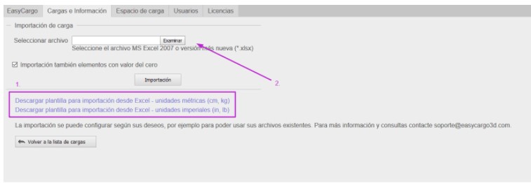 Sí, para esto es necesario utilizar nuestra plantilla, la cual se puede descargar directamente de la aplicación, en la pestaña “Cargas e información”, luego de hacer clic en el botón “Importación de carga”. En el siguiente paso, podrá elegir la plantilla según las unidades de medida (métricas o imperiales). Con ella podrá introducir los artículos, sus descripciones, sus dimensiones y las restricciones particulares.