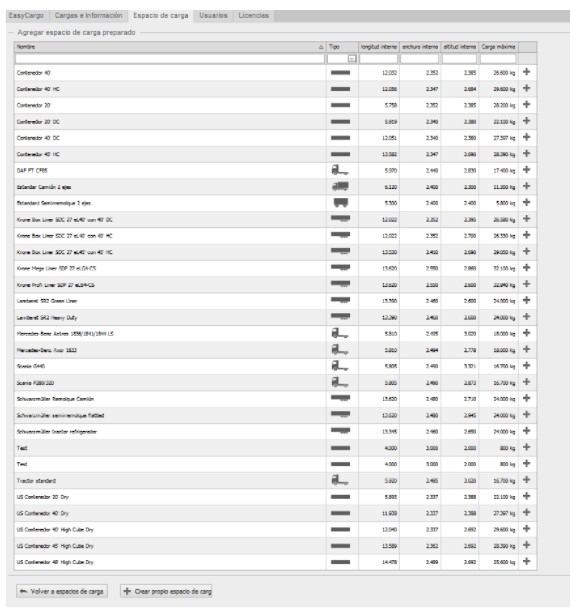 Hay diferentes contenedores, palets y camiones disponibles en nuestro catálogo. Puede encontrar algunos predeterminados en la aplicación en la pestaña “Espacios de carga”. Antes de utilizarlos, puede cambiarlos e incluso crear sus propios espacios de carga según sus necesidades.