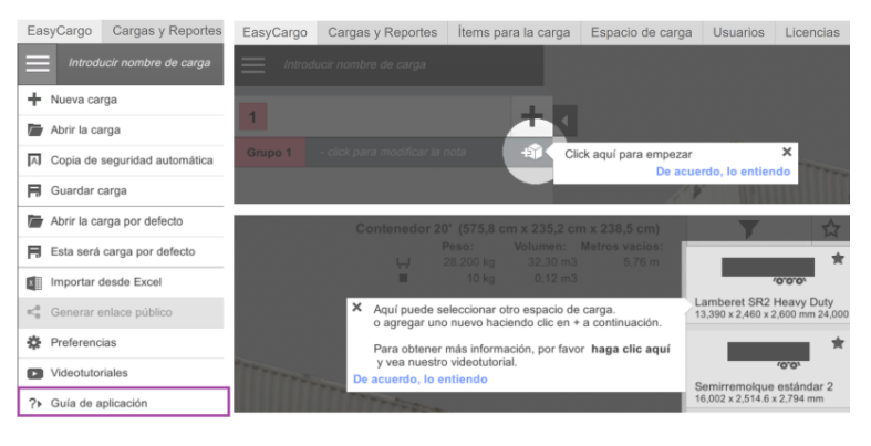 La primera vez que inicie sesión en la aplicación, el Tutorial integrado en la aplicación lo guiará por el proceso de planificación de la carga.